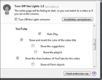 Via het optiemenu van Turn Off the Lights stel je een hoop zaken naar wens in. Zo verander je de transparantie en de kleur van het doek. Wil je tijdens het dimmen bijvoorbeeld wél de videotitel of de knoppen voor sociale media zien, dan is ook dit mogelijk. Turn Off the Lights ondersteunt tevens andere grote videosites die gebruik maken van HTML5-technologie, zoals Vimeo en DailyMotion. Daarnaast werkt de extensie voor zoekopdrachten met Google Afbeeldingen.